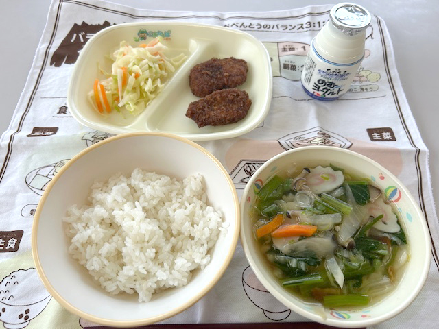 写真は2025年4月の駒っ子給食で、駒ヶ根市の名物の「ソースかつ」と「すずらんヨーグルト」の給食でした。お鉢のスープもただ物じゃありません。「春の山菜汁」と、山間部ならではの乙な献立となっています。(ごはん、ソースかつ、せんキャベツ、春の山菜汁、すずらんヨーグルト)